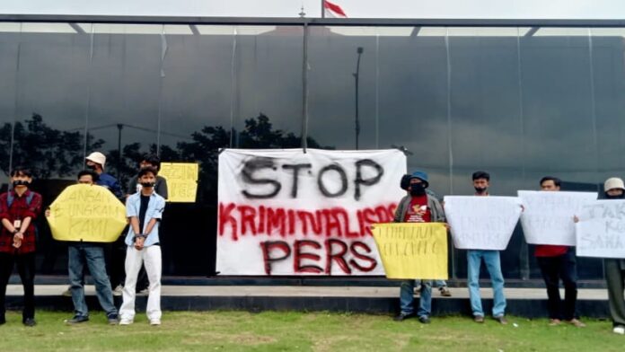 Massa juga membawa spanduk bertuliskan “Stop Kriminalisasi Pers” dan selebaran bertuliskan “Jangan Bungkam Kami”.