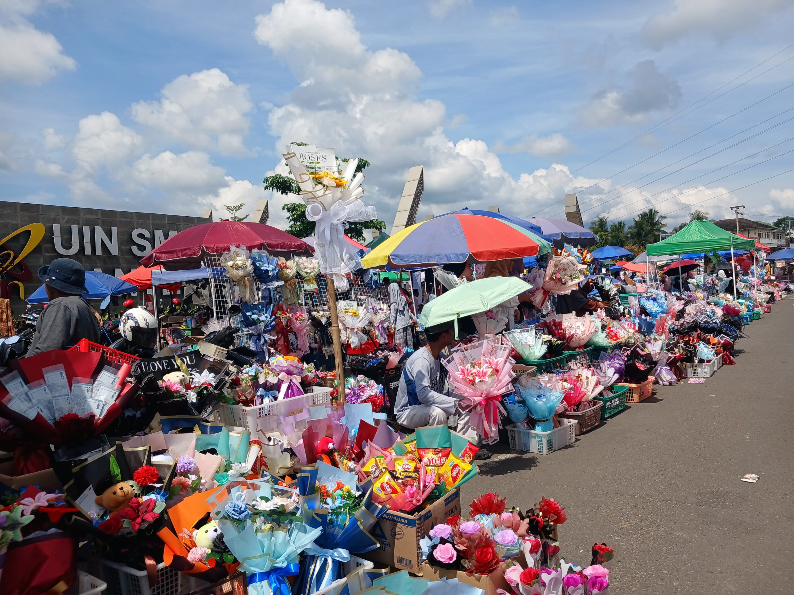 Serang, lpmsigma.com – Aroma bunga dan makanan menyebar di sepanjang jalan menuju gerbang utama Universitas Islam Negeri Sultan Maulana Hasanuddin Banten. Sejak pagi, trotoar sudah dipadati pengunjung. Ruang yang biasanya dilalui mahasiswa kini dipenuhi pedagang dan keluarga wisudawan, Sabtu (11/04/26).