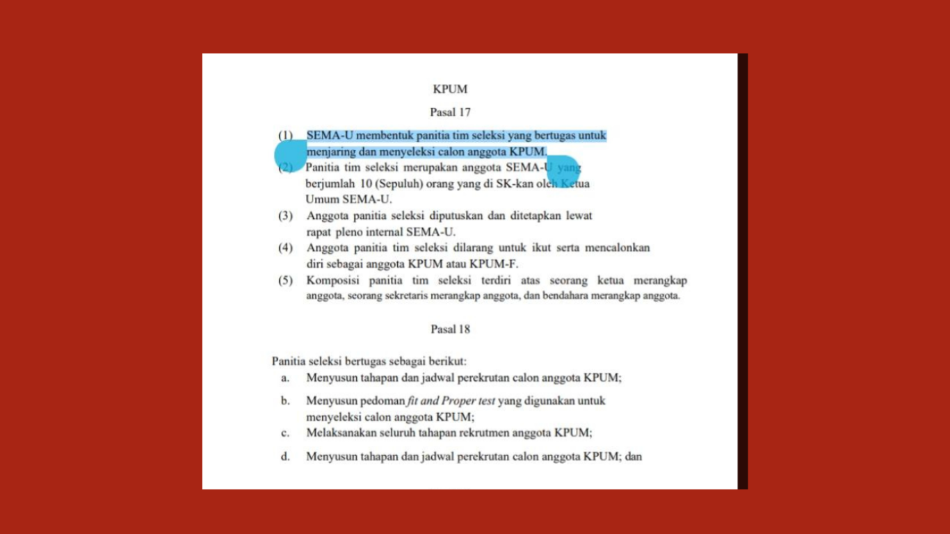 Mantan Ketua KPUM-U, Kahfi Achmadi, menyatakan bahwa pembentukan KPUM-U dan Bawaslu-M seharusnya menjadi kewenangan Senat Mahasiswa Universitas (Sema-U) sesuai dengan ketentuan dalam UUKBM Pasal 17 Nomor 1 Tahun 2026.
