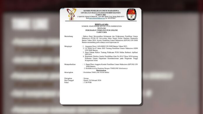 Serang, lpmsigma.com – Berita acara yang dikeluarkan oleh Komisi Pemilihan Umum Mahasiswa tingkat Universitas (KPUM-U), Nomor: 026/02/B/SEK-KPUM-U/UIN-SMHB/II/2026, tentang perubahan timeline Pemilihan Umum Mahasiswa (PUM) online, menuai kontradiksi.